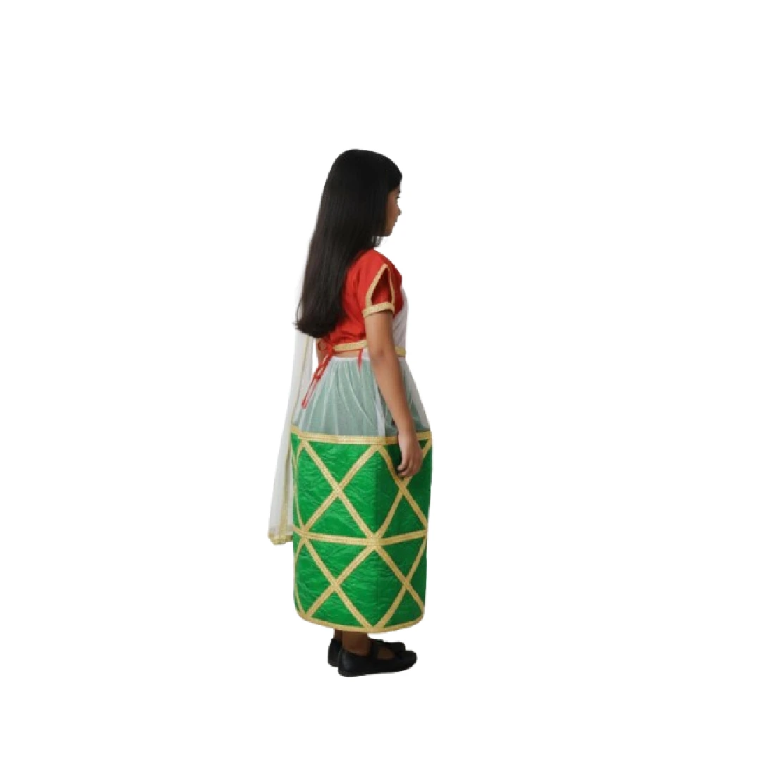 The outfit features traditional styling with attractive colours and decorative elements that replicate the authentic look worn during Manipuri folk and classical dance performances. Made with comfortable fabric and careful stitching, the costume allows girls to move freely while dancing or performing on stage.